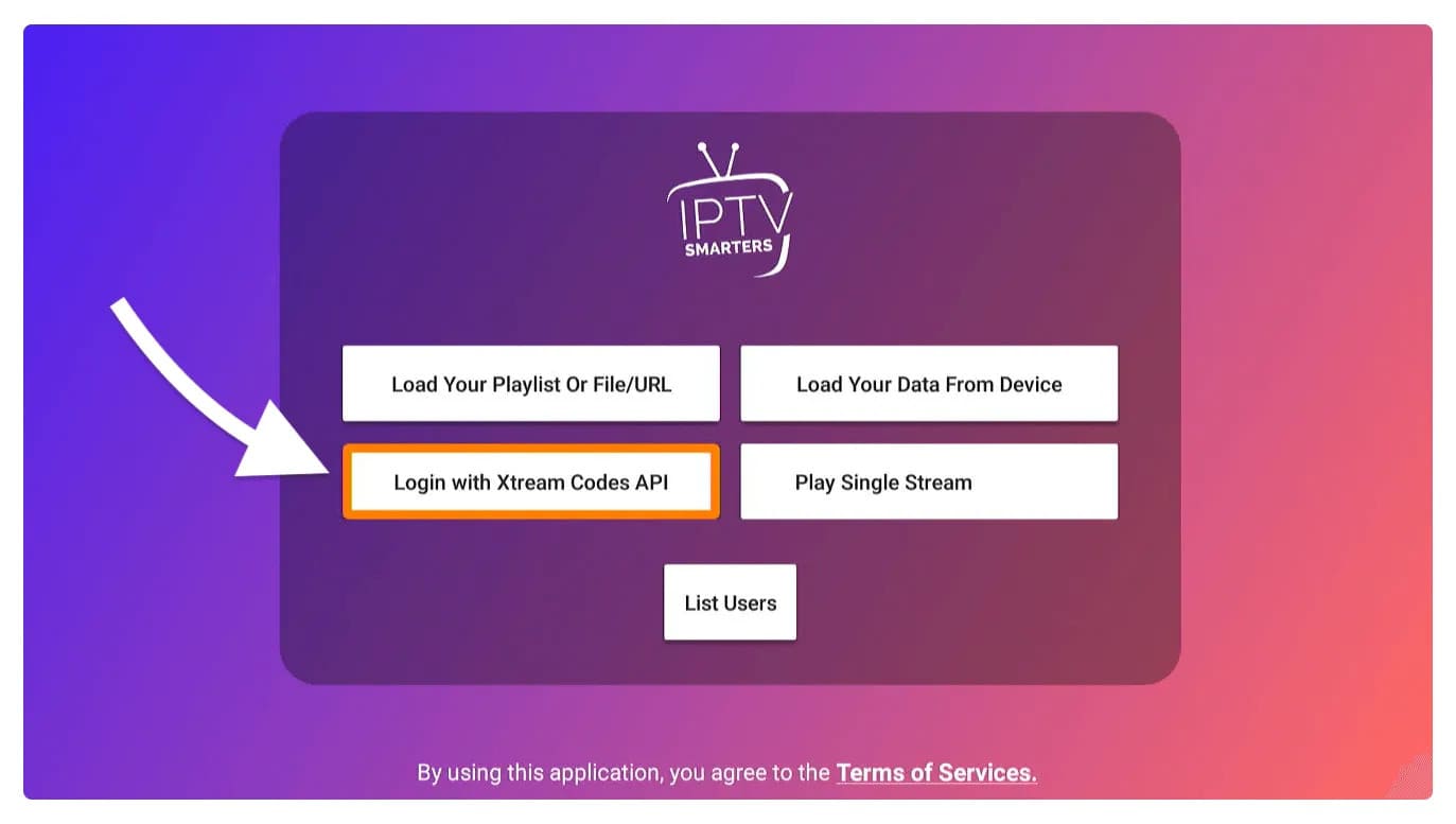 From the next screen, you will notice multiple options to Log Into the Smarters Pro. Now you need to choose Login with Xtreme Codes API which is the fast method.
