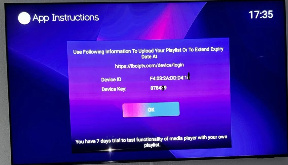 Upon the initial launch of the IBO Player app, you will encounter a screen displaying the MAC address and DEVICE KEY. Utilizing these two pieces of information, you can easily proceed with the service installation.